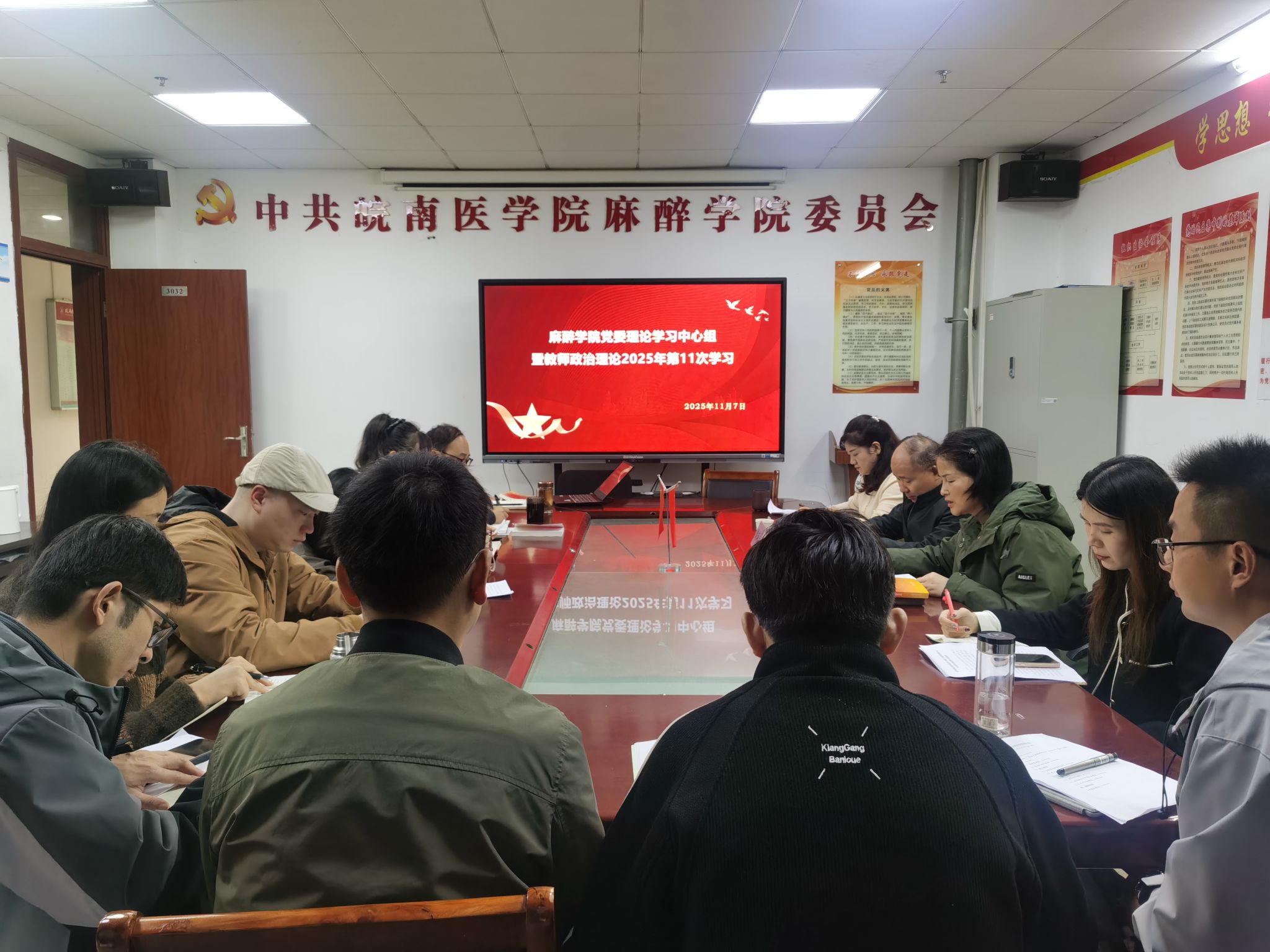 11月7日上午,麻醉学院在学院会议室召开2025年第11次党委理论学习中心组(扩大)会议暨教师政治理论学习会,开展党的二十届四中全会精神学习研讨。学院党委理论学习中心组成员、全体教师党员参加会议,校党委旁听工作组成员列席会议。会议由麻醉学院党委书记崔晓霞主持。
